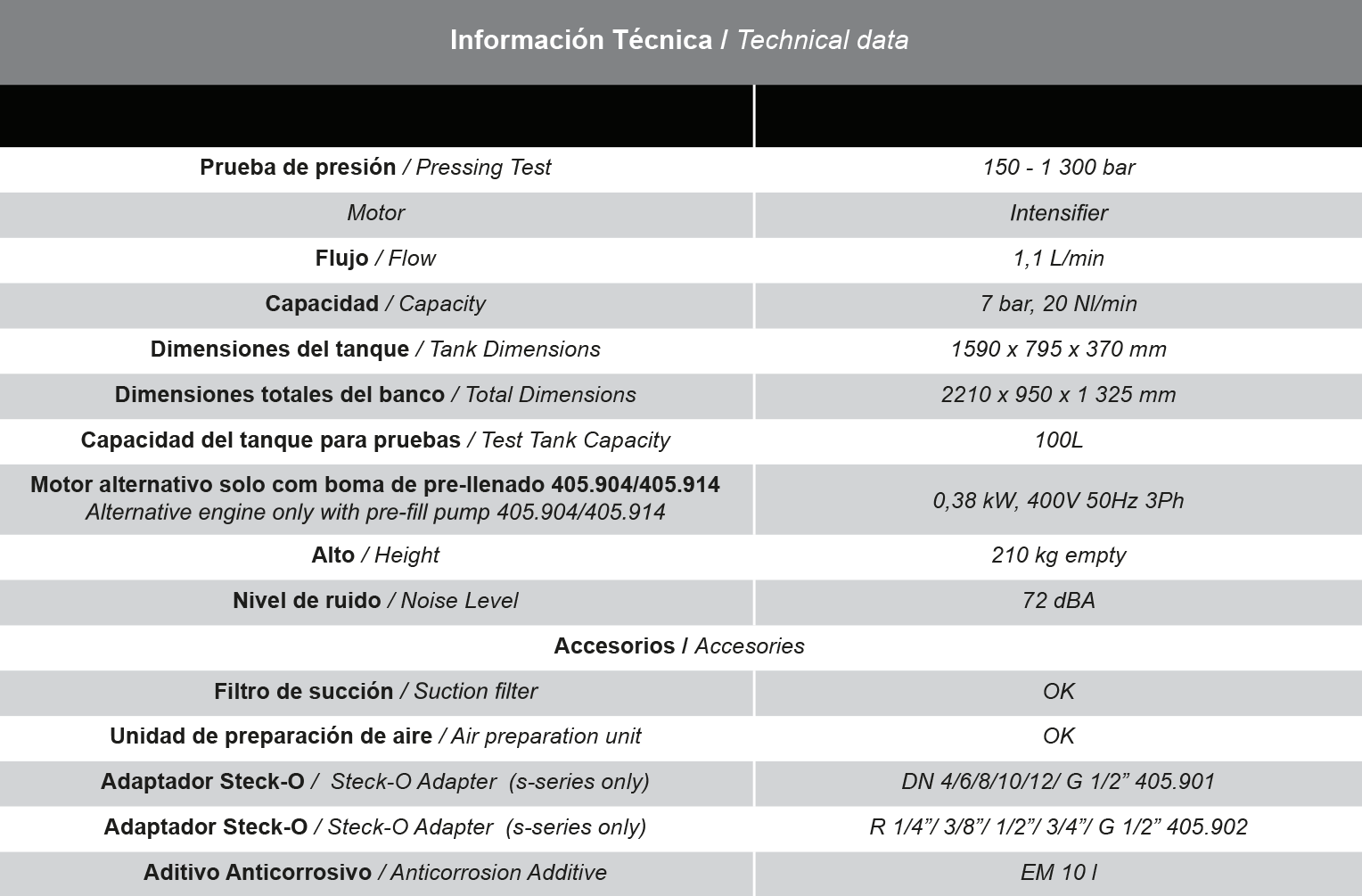 Llenado rápido y liberación automática de presión de las piezas probadas. – Cumple con norma Europea (CE) – Placa de seguridad transparente de policarbonato