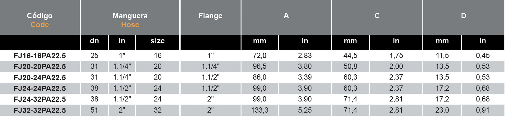 | Medida | FJ16-16PA22.5, FJ20-20PA22.5, FJ20-24PA22.5, FJ24-24PA22.5, FJ24-32PA22.5, FJ32-32PA22.5 |