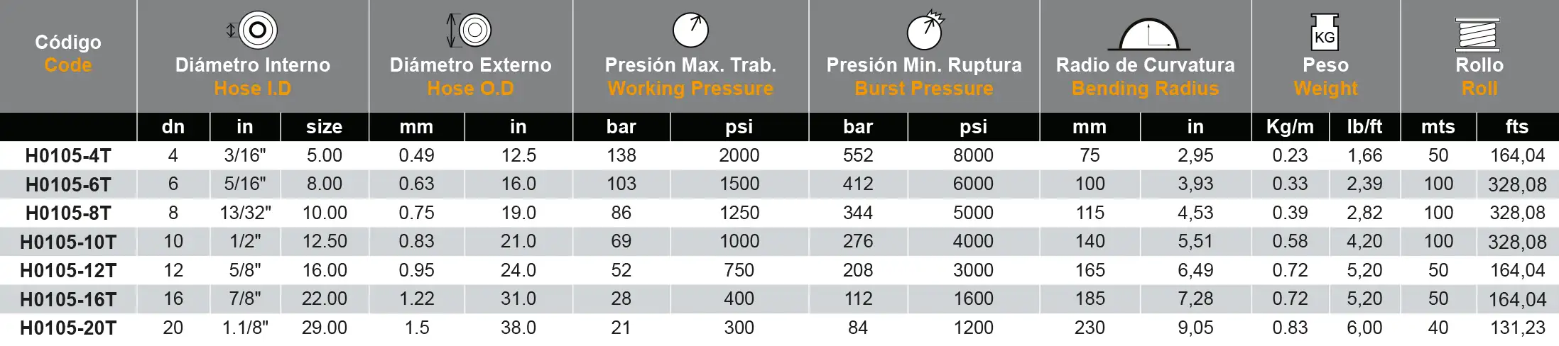 Tubo Interno: Mezcla de goma sintética resistente al aceite y alta temperatura